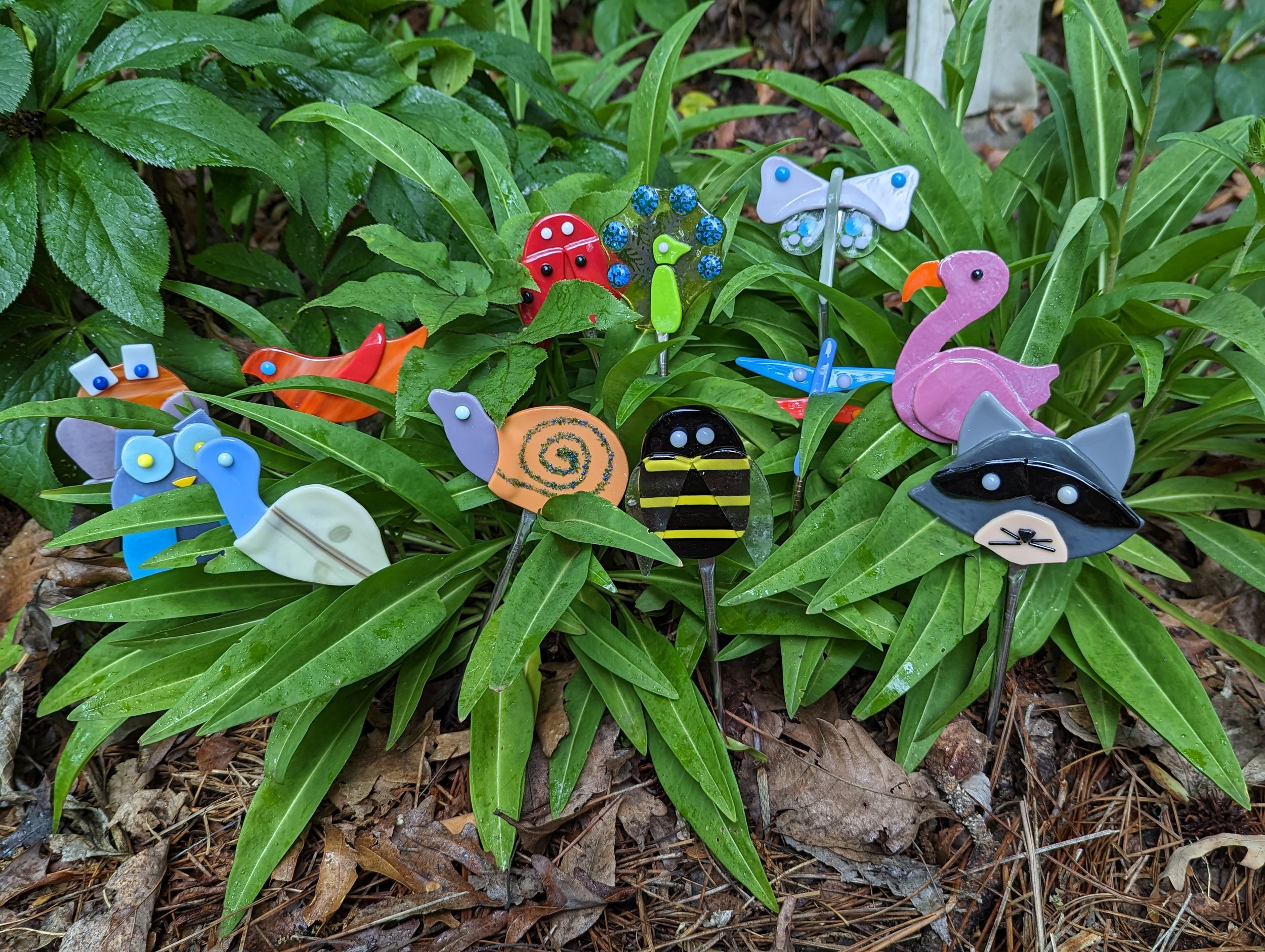 I have posted previously about our plant peepers. They are fun, whimsical creatures made of colorful glass and mounted on a stainless steel straw. They are designed to perch in a potted plant to add color and make you smile, or they can sit out in your garden to draw your attention as you gaze from the window.