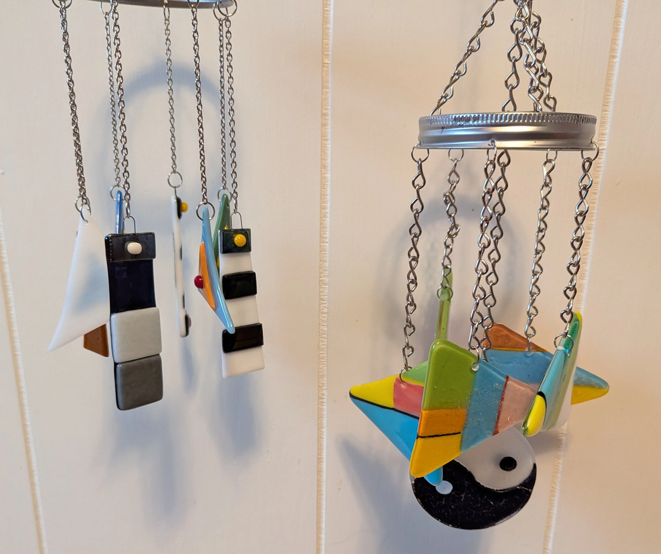 Shown here are two new wind chime designs from DarionGlass. One is beach-themed with North Carolina lighthouses alternating with fanciful fish. The other style features a variety of mid-century designs that are color blocked triangles, with a stark black and white yin yang circle to create more volume of sound. Both are hanging from a re-purposed canning jar ring.