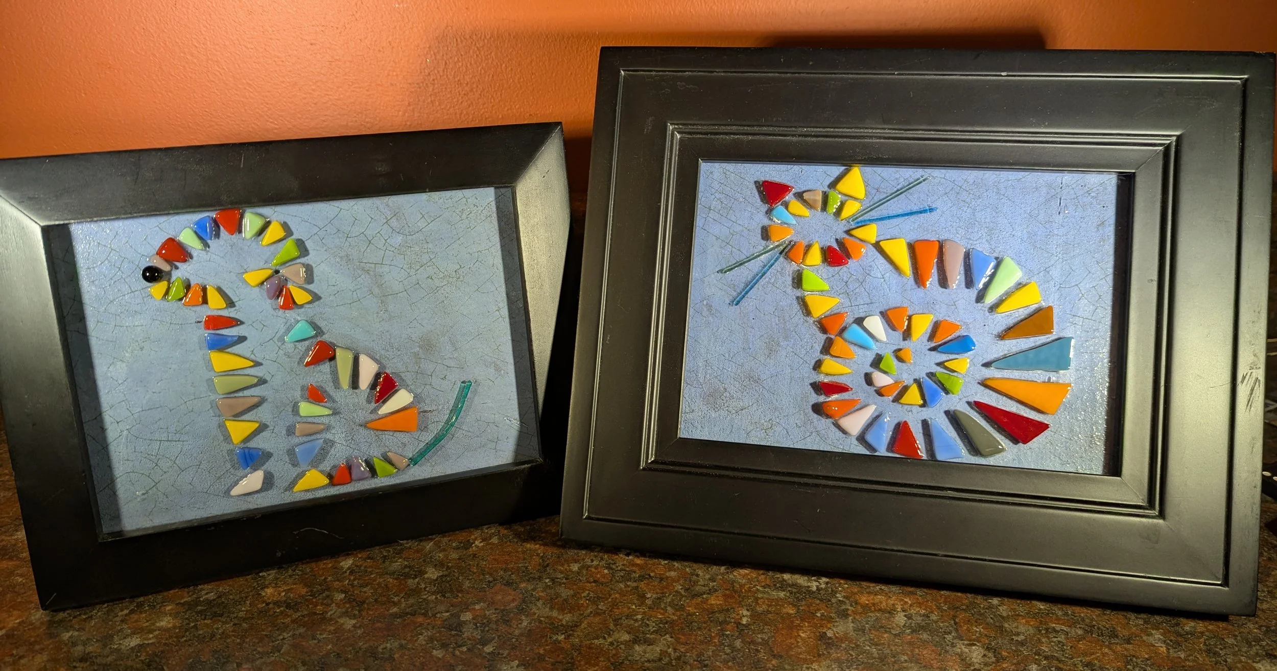Although DarionGlass has produced a variety of animals as plant peepers and ornaments, we haven’t done a lot with the favorite cat and dog suggestions from our customers. That request is now honored with these new mosaics designed to remind you of that favored pet and bring a smile to your face with the bright colors and suggestive design. The dog has a black nose and an upturned wagging tail. The cat is curled up in comfort with ears and whiskers alert for any important action. Each mosaic is made of opaque glass and fits a 5 x 7 frame to sit on your tabletop or hang in an oft-viewed space.